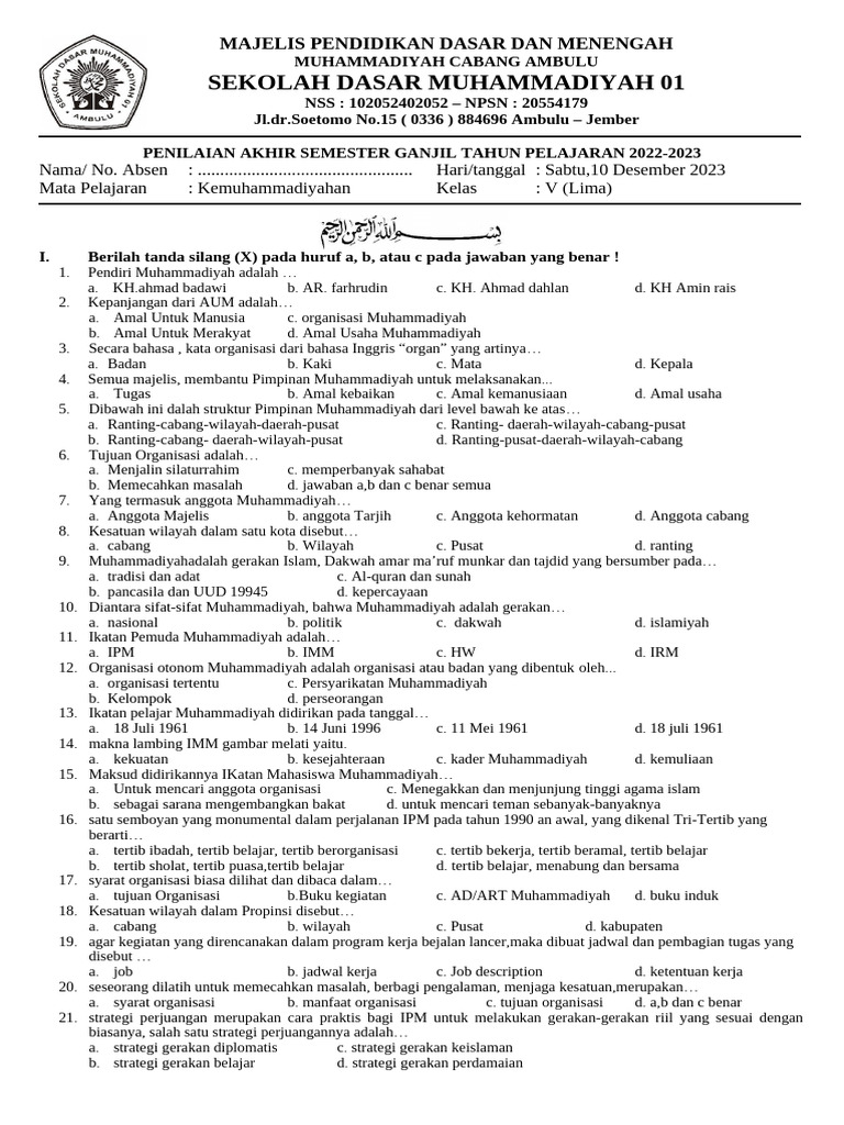 Memasuki semester genap di kelas 10, siswa diharapkan telah memiliki pemahaman dasar mengenai sejarah, visi, misi, dan prinsip-prinsip dasar Muhammadiyah. Kali ini, kita akan membahas contoh-contoh soal yang dapat menguji kedalaman pemahaman siswa terhadap materi Kemuhammadiyahan di semester 2, mencakup topik-topik krusial yang relevan dengan perkembangan zaman dan tantangan global. Artikel ini akan menyajikan berbagai tipe soal, mulai dari pilihan ganda, esai singkat, hingga studi kasus, untuk memberikan gambaran komprehensif mengenai cakupan materi dan kedalaman analisis yang diharapkan.